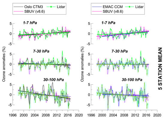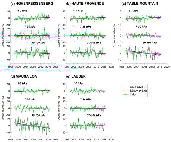 Monthly mean ozone profiles from lidar instruments were obtained by averaging daily profiles from the Network for the Detection of Atmospheric Composition Change (NDACC, www.ndacc.org) database at ftp://ftp.cpc.ncep.noaa.gov/ndacc/station/(last access: 12 September 2018) [,,]. For all stations, the profiles from the (monthly) NASA-Ames files are used. The lidar measurements are given as number density (molecules cm−3) versus altitude []. From these measurements the column densities in matm cm (DU) were calculated for 3 layers (3–7, 7–30 and 30–100 hPa), representing the upper stratosphere, middle stratosphere and lower stratosphere, respectively, according to the methodology described by Zerefos et al. []. The list of 5 lidar stations analyzed in this study is given in Table 1. The period of analysis is January 1998 to December 2016.