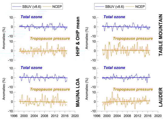 Trends (% per decade) in total ozone from SBUV data and tropopause pressure from NCEP reanalysis data for the period 1998–2016, at five lidar stations, after removing variability related to the seasonal cycle and dynamical proxies.