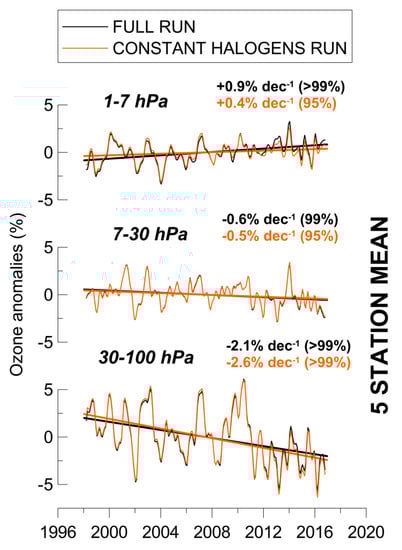 With CTM3, we were able to quantify the effect of reducing halogen emissions on the upper- and the lower-stratospheric ozone trends. Simulations with the Oslo CTM3 model (black line) indicate that ozone in the upper stratosphere increased slowly from 1998 to 2016, by about 1% per decade, in agreement with SBUV satellite data. A separate simulation using fixed halogen emissions at 1998 levels (orange line) was performed to evaluate the effect of reducing ozone-depleting substances on the vertical ozone trends. The results are presented in Figure 4. The trends from the two model simulations (full vs. fixed halogens) were found to differ by 0.5% per decade. This difference is attributed to the reduction of halogen emissions in the atmosphere. In the lower stratosphere, the model reveals statistically significantly negative ozone trends of about −2% per decade. Here, the difference in trends between the two model simulations is also 0.5% per decade; however, we can easily infer that the reduction of halogens after 1997 explains about 55% of the upward trend in the upper stratospheric ozone (1–7 hPa) and about 24% of the trend in the lower stratospheric ozone (30–100 hPa).