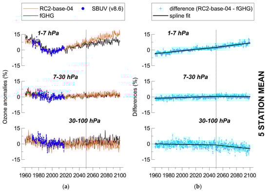 In the long-term, the differences between the two model simulations show a positive trend in the upper stratosphere, no trend in the middle stratosphere and a negative trend in the lower stratosphere, which becomes evident after the 2040s. The upward trend in the upper stratosphere is explained by the fact that increases in GHGs lead to cooling of the upper stratosphere, which slows down temperature-dependent odd-oxygen loss processes and increases upper-stratospheric ozone []. On the contrary, lower-stratospheric ozone is decreasing due to the evolution of GHGs.