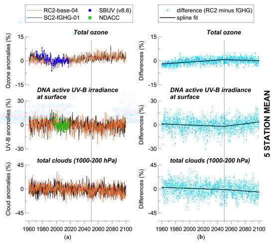 The effect of increasing GHGs on long-term ozone and UV-B radiation trends was studied by comparing two free-running hindcasts and projection simulations: a reference simulation with background GHGs mixing ratios, as embedded in the simulated sea-surface temperatures and sea-ice concentrations, which were used as input to the model (RC2-base-04) [], and the same simulation with fixed GHGs at 1960 levels (SC2-fGHG-01) []. The UV-B radiation calculated by the photolysis scheme (JVAL) [] was weighted by DNA damage potential []. Total cloud cover was determined for the RC2-base-04 and SC2-fGHG-01 simulations by summing the cloud-cover data for model levels from 1000 to 200 hPa.