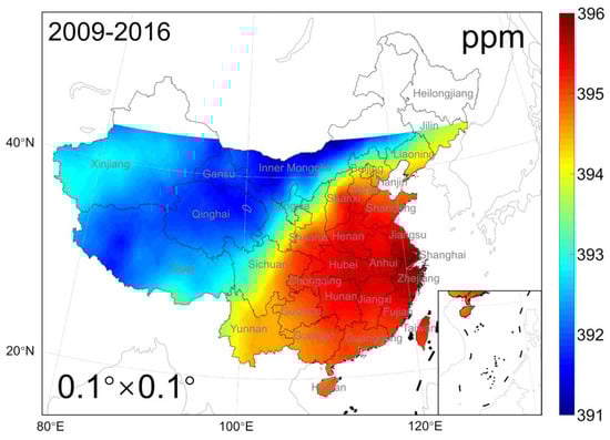 Atmospheric carbon dioxide (CO2) is an important element of the global carbon cycle and a major greenhouse gas due to its extensive contributes to global warming. CO2 concentrations have increased by more than 40% since the Industrial Revolution []. In addition, a warmer climate with adverse consequences, such as rising sea levels and an increase in extreme weather conditions, mean that further increases in CO2 levels are expected []. More specifically, according to the National Oceanic and Atmospheric Administration (NOAA), the global CO2 concentration increased from 368.84 ppm in 2000 to 402.86 ppm in 2016, with an average growth rate of 2.06 ppm/a []. Since 2006, China has been the world’s largest emitter of CO2 [,]. The annual growth rate of atmospheric XCO2 concentration reached 2.16 ppm/a in China, and the monthly average concentration of CO2 exceeded the global average by 1.63 ppm during 2006–2016. For example, in 2016, China released approximately 1.02 × 104 Mt CO2 into the atmosphere, contributing to 28% of total global carbon emissions []. Furthermore, CO2 emissions in China exceeded the total emissions of the United States, the European Union and Japan in 2016 []. Therefore, the CO2 emissions in China have a significant impact on global atmospheric CO2 concentrations.