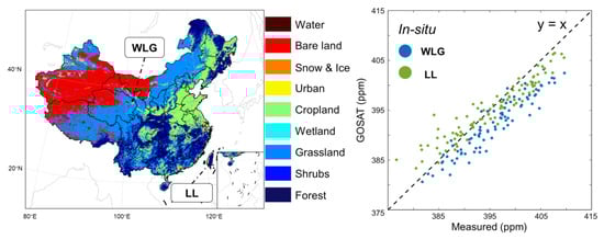 We selected monthly data from TANSO FTS SWIR based on the NIES Level-2 V02.72 algorithm during April 2009 to December 2016. However, due to the observation orbit of GOSAT, data was unavailable for each pan-winter (November to March), resulting in a large number of missing values for high latitudes across the globe. Therefore, we analyzed two conditions of the whole year, as well as the vegetation growing season during 2009–2016. Furthermore, we compared the corresponding satellite data with site observation datasets from atmospheric background stations (Mt. Waliguan (WLG) Station (100.9° N, 36.28° E) and Mt. Lulin (LL) Station (23.47° N,120.84° E)) in China, in order to verify the accuracy of the GOSAT data. The site observation datasets were obtained from the National Oceanic and Atmospheric Administration Earth System Research Laboratory (NOAA/ESRL) in the World Greenhouse Gas Data Center (WDCGG) from 2009 to 2016.