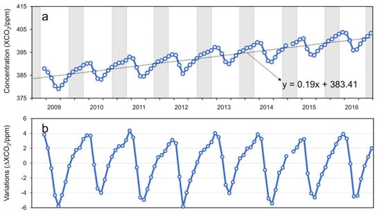 (a) Monthly changes and (b) detrended XCO2 concentrations in China during 2009–2016 with gray indicating winter (data vacancy in January 2015).