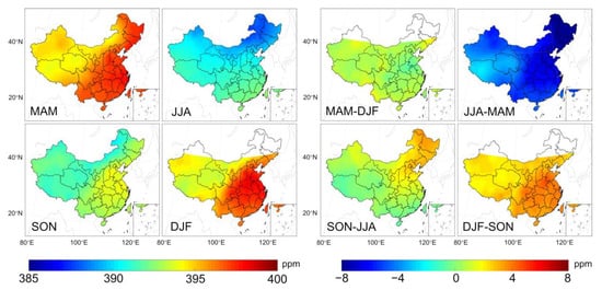 Seasonal averages of XCO2 (ppm) from GOSAT over China during 2009–2016 and changes between seasons. MAM: March, April and May; JJA: June, July and August; SON: September, October and November; DJF: December, January and February.