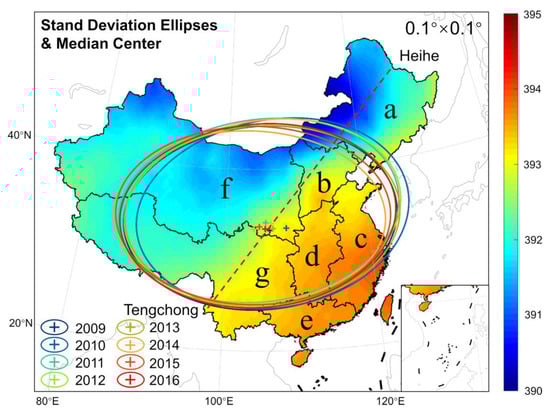 Standard deviation ellipse (SDE) analysis is commonly used to analyze spatial distribution directional characteristics with time. The size of the ellipse reflects the concentration of the overall elements of the spatial pattern, while the declination (long semi-axis) reflects the dominant direction of the spatial pattern. Using years of standard deviation statistics enables us to understand average center, major/minor axes and azimuths trends of the discrete point set in time series [,]. Therefore, the standard deviation ellipse can express the main distribution direction of a set of points and the degree of dispersion in all directions. These two factors are usually used to describe the overall characteristics of a geospatial distribution []. In the current study, we applied SDE analysis results of the annual mean XCO2 concentrations in China from 2009 to 2016. By plotting the abstract images of the elliptical motion trajectories of China’s annual average XCO2 concentration, the dynamic changes of these ellipses over time are obtained, which cannot be demonstrated using a pixel-level analysis. Therefore, we used an SDE analysis of the annual mean XCO2 concentrations in China from 2009 to 2016.