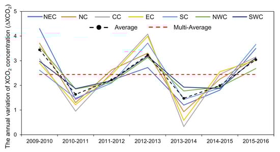 During the growing season, large differences were detected between the XCO2 variations (∆XCO2) in sub-regions per year (Table 2). In China, the ∆XCO2 values exhibited a gradual downward trend (y = −0.04x + 2.61) during the growing seasons of 2009–2016 (Figure 6). However, at high latitudes, the average ∆XCO2 rates in NWC and NEC was rapidly reduced (−0.1 ppm/a). The second is North China, where the average ∆XCO2 decreased at a rate of −0.05 ppm/a. Furthermore, ∆XCO2 values in SWC were observed to fluctuate by 2–3 ppm/a, with relatively stable growth rates. However, in CC and EC, atmospheric XCO2 levels exhibited a small upward trend (+0.04 ppm/a). The fastest annual growth trend was observed in SC, with the average ∆XCO2 rate reaching + 0.19 ppm/a and concentrations exhibiting an accelerated upward trend.