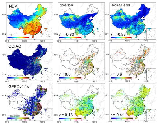 Biomass burning emissions are a key source of atmospheric CO2 [,]. Based on the biomass burning emission inventory (GFEDv4.1s) and derived CO2 emissions in China (Figure 7), the annual average CO2 emissions from biomass burning in China was determined as 76.9 Tg, with emissions distributed in Heilongjiang Province (14.4 Tg/a) and the three provinces along the southeastern coast (13.8 Tg/a). Yunnan Province in SWC (7.78 Tg/a) exhibited strong correlations with forest fires (55%) and the burning of savanna, grassland and shrublands (36.7%). The correlations of Heilongjiang Province in northeast China were slightly weak, yet the largest annual average emissions in China were associated with this region, and among them, agricultural straw waste burning was the main source of emissions (76.3% of total biomass burning emissions). In the eastern coastal areas, biomass combustion emissions were more evident, and the main combustion type was agricultural waste combustion (51.5%). However, the correlation between biomass burning emission of this region with variations in atmospheric XCO2 concentration was low (r = 0.13). In particular, in the eastern part of China, several areas exhibit negative correlations (Figure 7, GFED2009–2016). In addition, it has been observed that this area is also an area of high human activity (Figure 7, ODIAC). The same situation also occurred in the Pearl River Delta region, where human activity is strong in low and middle latitudes. Biomass burning emissions were greatly affected by human activity, and mainly occurred during spring. This spatial distribution trend determined here is similar to Qiu et al. [].