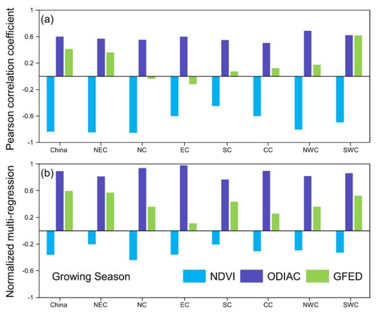 The partial correlation and regression coefficients of the standardized multiple regression equations reveal the influence of the NDVI, ODIAC and GFED on atmospheric XCO2 concentrations across different regions (Figure 8). NDVI (vegetation photosynthesis) had the greatest influence on the spatial pattern of atmospheric XCO2 concentrations. Although photosynthesis plays a key role in various regions of China, its inhibition of XCO2 concentrations is limited. Fossil fuel combustion, considered as the leading cause of the rapid growth in atmospheric XCO2 concentrations in China, was the main carbon source of CO2, particularly in medium and large cities (Figure 7). The regression coefficients almost reached 0.9 in sub-regions, with that of EC almost reaching 1.0. Biomass burning also contributed to XCO2 concentrations in China, with contributions exhibiting significant regional heterogeneity, particularly in Yunnan Province in the southwest and Heilongjiang Province in the northeast (Figure 8b).