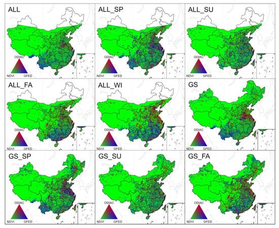 In summary, we used NDVI to represent carbon sinks, and human activities and fire emissions to represent carbon sources. We then quantified the effects of the fires, human activity and NDVI on the temporal changes in XCO2 concentration per pixel during 2009–2016 (Figure 9). We found that NDVI dominated the whole study area, denoted by temporal XCO2 variations, particularly in southwest and northwest China. A strong correlation was observed between NDVI and XCO2, indicating that NDVI was the major influencing factor among the three factors in most parts of southwestern and northwestern China. However, the contribution rate of the three influencing factors in the other five regions exhibit significant seasonal variations, particularly in the east of Hu-line (red line in Figure 5). More specifically, the distribution of human activity and fire emissions were evaluated over the entire growing season. The areas where human activity (e.g., fossil fuel combustion) affected atmospheric XCO2 concentrations were generally located in Shandong, Jiangsu and Henan Provinces, followed by Xi’an, Chengdu and Kunming. In the southeastern coastal areas and main inland urban areas, although fire emissions were high and human activity was intense, they were not focal influencing factors in these areas. Fire emissions predominantly occurred in Yunnan Province, and were also detected close to Henan Province and Chengdu.