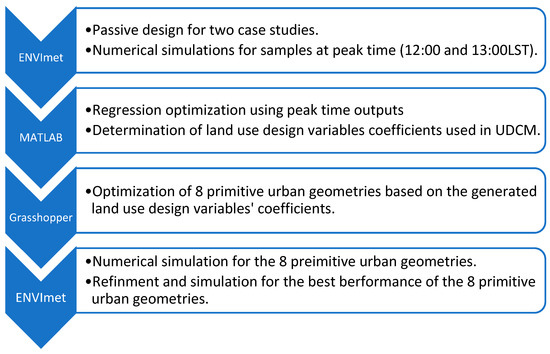 While ENVI-met is regarded as a reliable and validated microclimate simulation tool at early urban design stages, it doesn’t support bigger climate scales’ simulations with regard to the city and regional scales which can be generated through field measurements in order to either project them in future with consideration to climate change scenarios, downscale them in order to generate recent weather files or couple different climate scales models’ generated by them, the work of Li, H., et al., is just an example not to mention [122,123]. On the other hand, microclimate simulation tools have limitations with regard to computational optimization of urban form designs according to environmental conditions. Even after implementing most of its new options in the Grasshopper canvas through Dragonfly plugin [124] to generate required model and simulation files. This connection has two main advantages: (1) significantly reduces time required for modelling and simulation setup processes, especially when investigating several microclimate models. (2) facilitates the ability to import complex and non-traditional building 3D shapes into ENVI-met spaces. However, retrieving simulated readings and generating microclimate maps are executed manually after finishing the simulations. Hence, parametric microclimate and outdoor comfort simulation tools are regarded as the most suitable alternative for urban form optimization process. Yet these tools have their own shortcomings regarding computational power, user experience and the credibility of the simulation outputs.