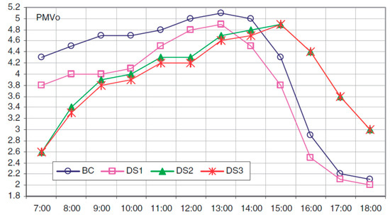 The figure illustrates that an urban form with comprehensive passive design applications concluded a shift in heat gain, loss and an urban time lag of about 2 h; Bas case (BC), design suggestion no.1 (DS1) is a clustered housing over the same vehicular network, design suggestion no. 2 (DS2) is a newly designed clustered housing with adjusted aspect ratios and green infra over a new vehicular network, whereas DS3 is the same as DS2 but with higher albedo for building surfaces and asphalt roads. It has to be noted that curves in Figure 2 report modified PMV values according to Jendritzki and Nubler [46].