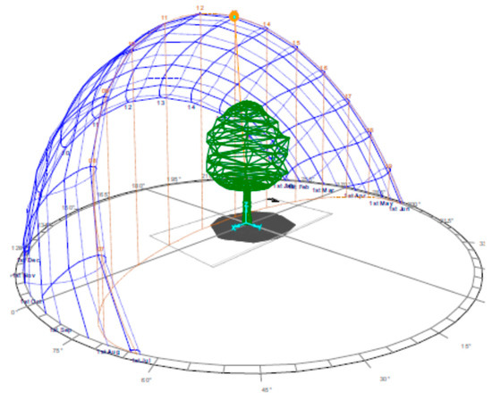 A 3D modeling for the solar path diagram of Cairo at 13:00LST (Local Solar Time) indicates an altitude angle of 82°40’ which is empirically generated an LAI of at least 1 to conclude a ground solid shade of flat leafs urban trees.
