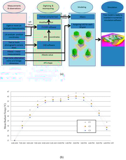(a) Methodology of generating LAD values to simulate a single (isolated) tree in meteorology numerical simulation software, [60,69]. (b) Tmrt comparisons between different cases of a site in Alexandria, Egypt; C1 is without trees, C2 is with trees of LAI = 1, and C3 is the site with measured LAI.