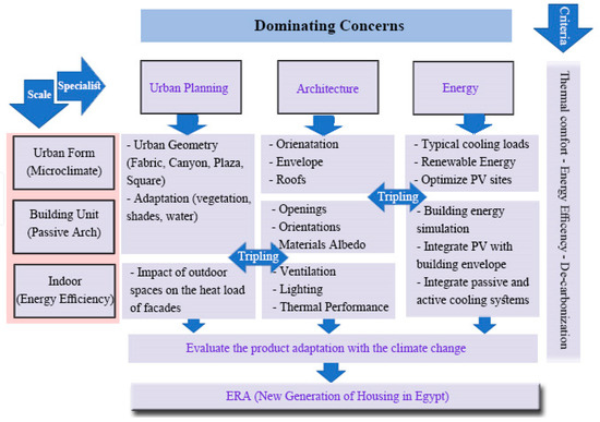 Gathering the research line that has been presented through Section 3, Section 4 and Section 5 of this article for the urban built environment elements in the Egyptian context; fabric, network and vegetation, this section presents a vision for a new ERA of Egyptian housing through the integration of both passive architecture and passive urban design scales that conserves energy, and the triple core mission of ERA can be completed by proposing a renewable system that might be applied both on building envelope and on-site land use. It worth mentioning that ERA is a two parts proposed research project collaboration between multidisciplinary experts and it has been designed in three steps for the sake of a new generation of Egyptian energy efficient housing and resilient cities; (1) It starts in the urban form were a geo-informatics drone assisted surveys and auditing will take place for thermal imagery and meteorological measurements to be used for energy retrofitting of existing housing. (2) It suggest the clustered urban form for medium population (medium and social class housing) which is built on prior findings illustrated in the previous sections of this article; it identified the neighborhood clustered urban form as an appropriate residential archetype. However, a parametric optimization should be used to generate the most suitable building-courtyard relation of cluster geometry according to each climatic zone configuration on the Egyptian map which is the core of the new ERA housing typologies of the project. (3) It focuses on the residential building and its passive cooling techniques according the Egyptian code for energy efficiency. A whole-building energy simulation will be conducted depending on the urban simulations’ outcomes from the first step using coupled simulation methodology. (4) The fourth step incorporates the possible solutions for introducing PV systems into the building envelope as an integrated building active-passive design. ERA has a tripling evaluation methodology (TEM) that explores the impact of neighborhood configurations have on urban microclimate conditions, and in turn on urban housing energy efficiency, considering also the improvements of urban form that may affect the PV/envelope system. ERA suggests considering the climate change scenarios to adapt its generated housing for future. ERA project proposal is still under development and didn’t have results yet.