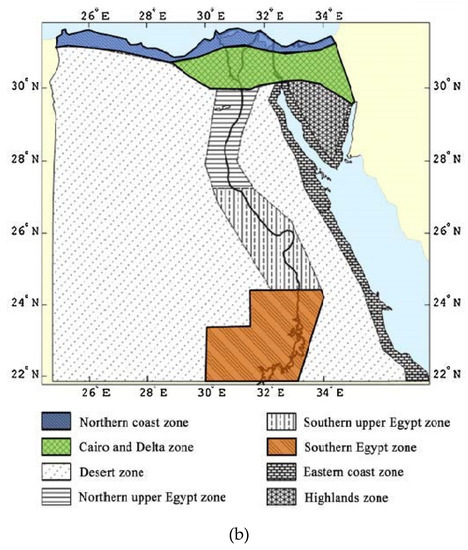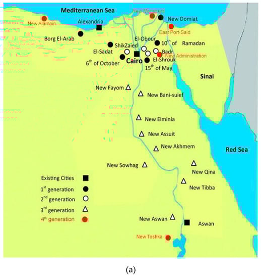 (a) Generations of New Cities in Egypt since 1970s, modified after (Hegazy and Moustafa 2013) [140]. (b) different climatic zones in Egypt, [137], (North is up and scale is to fit).