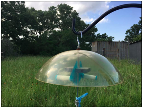 Radiello samplers containing Carbograph 4 sorbents were placed inside yellow diffusive bodies (all Radiello materials were purchased from Sigma-Aldrich, USA), underneath a protective shelter to keep out rainwater, approximately one meter above the ground (Figure 1). Two diffusive bodies (replicates) were placed under the shelter on a volunteer’s private property approximately 100 meters from the nearest equipment on an oil well site. A third sampler was kept onsite inside its protective glass container as a field blank for quality assurance purposes. Three sets of samplers were used: one in deployment, one in reserve (spare), and one undergoing analysis. The volunteer was trained to exchange the cartridges once weekly and replace them with the spare set, then bring the exposed set to our laboratory at Texas A&M University in College Station, Texas, in exchange for the next spare set. Analyzed and pre-cleaned cartridges (heating for 20 min at 220 °C under high purity H2 flow) were stored for up to a week in their glass containers, then deployed for one week during a 52-week span from September 2018 to September 2019. To avoid bias and assess the quality of the sorbents, the cartridges and their diffusive bodies were randomly selected each week.