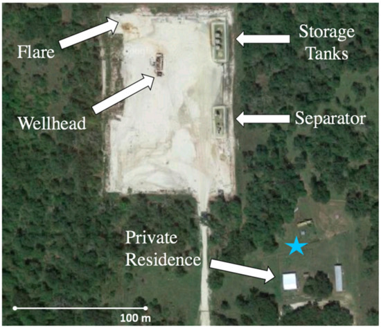 The studied oil and gas production site, located toward the northeast end of the Eagle Ford shale in south central Texas, was northwest of the samplers (Figure 2). The site was observed to have an occasional flare in its northwest corner, which was located approximately 200 meters from the sampling location. The small flare, along with venting storage tanks and potentially leaky pipes and other equipment, was suspected to provide the majority of local exposure to hydrocarbons, because car traffic density as the commonly major source is very low in this rural area (~200 cars per day). The nearest main road, State Highway 30, lies 5.5–6 km to the site’s south and southwest, and bears only 7500–9500 annual average daily vehicle traffic (Texas Department of Transportation (TxDOT), https://www.txdot.gov/inside-txdot/division/transportation-planning/maps.html). The nearest urban area, Bryan (College Station), with approximately 200,000 residents, lies 20 km to the west, a wind direction very rarely encountered in east Texas.