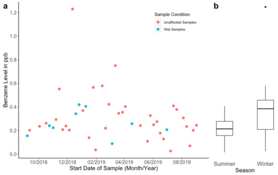 Seasonal changes in benzene levels. Each point (a) is plotted by the start date of the sampling week. ”Summer” and “winter” value boxplots (b) encompass three months of data, and were statistically significantly different at the 90% confidence level (p < 0.07).
