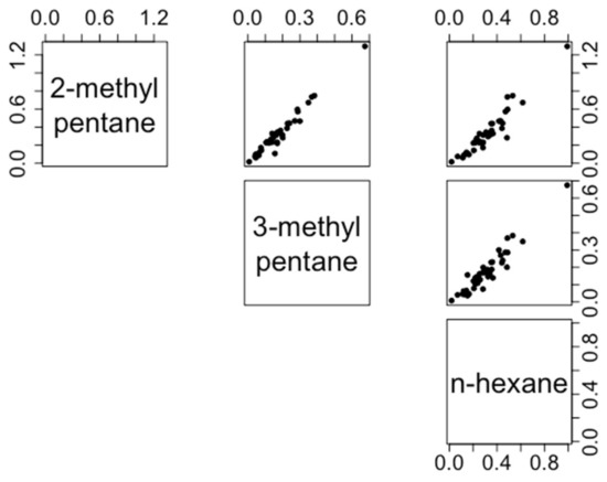 Relationships between C6-alkanes (in ppb) during the 52-week sampling period. All Spearman’s rank correlations exceeded 0.9.