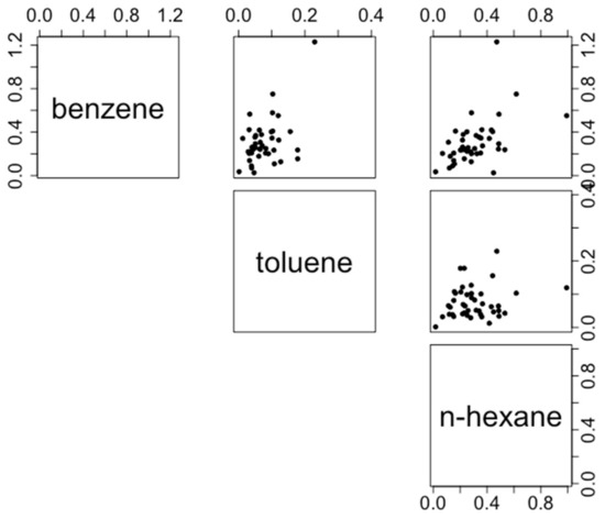 Relationships between aromatics and non-aromatics (in ppb). In this case, Spearman’s rank correlation coefficients ranged from 0.27 (toluene-benzene) to 0.56 (benzene-hexane).