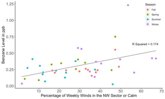 When benzene levels were compared to the percentage of weekly winds from the northwest sector, including calm conditions, we found a significant dependence, as shown in Figure 6. Northwesterly winds bring emissions from the oil production site to the sampler location (Figure 2), and calm conditions were included to account for the drifting of hydrocarbon emissions toward the samplers when the wind fails to disperse them effectively. The significant increase with higher percentages of northwest and calm winds suggests that hydrocarbon emissions from the site have a greater impact on off-site exposure when winds from the site flow towards those living downwind or when the conditions are calm, allowing local accumulation of emissions. This correlation, though present in most seasons of the year (Figure 6), was highly variable, likely because (i) the fraction of NW winds in this area may have significantly differed from that measured 30 km away; and (ii) the well-site was not a regular and high producing location, and thus likely not a steady high emissions source. In addition, dispersion, which is affected by wind speed, is not accounted for in this analysis.