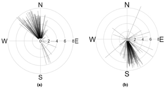 Wind distribution stick plots. Each “stick” represents the average wind direction and speed (in meters per second) during one hour of the indicated week (168 hours); 65% of all sticks fell in the NW sector (a), while only 5% fell in the NW sector (b).