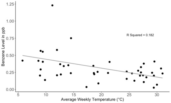 In addition to wind direction, benzene levels were also significantly correlated with temperature, as shown in Figure 8. This may be interpreted as the seasonal effect of lower boundary depths during the cooler season, for which temperature may serve as a proxy.