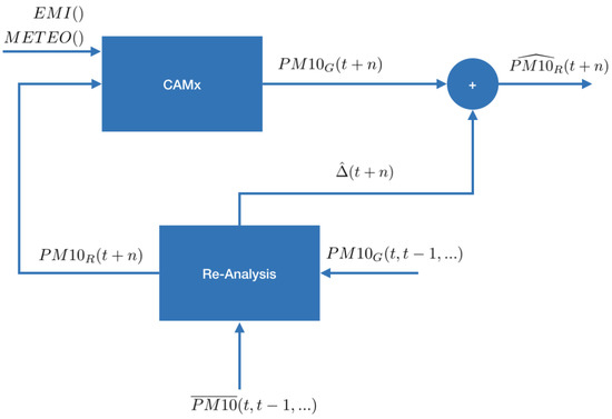 Figure 1 presents the implemented methodology components and their relationship. At time t, the system computes the forecasting of PM10 concentration at time using the results of a re-analysis phase that integrates the output of the CAMx model () and the measurements () available at the beginning of the forecast. The methodology has three main scopes:
