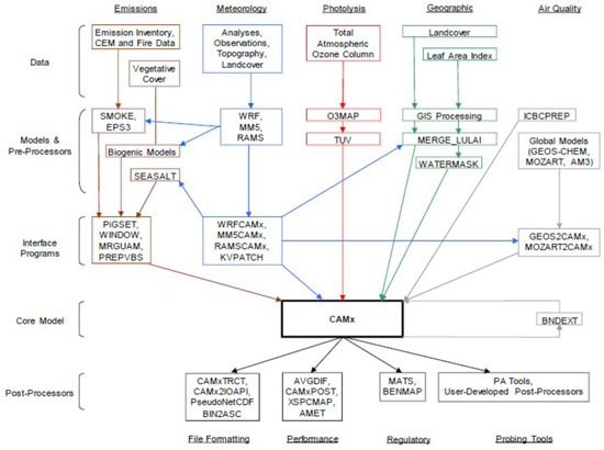 Figure 2 [31] presents all the modules, processors and interface between the CAMx and the different information sources used to produce its input.