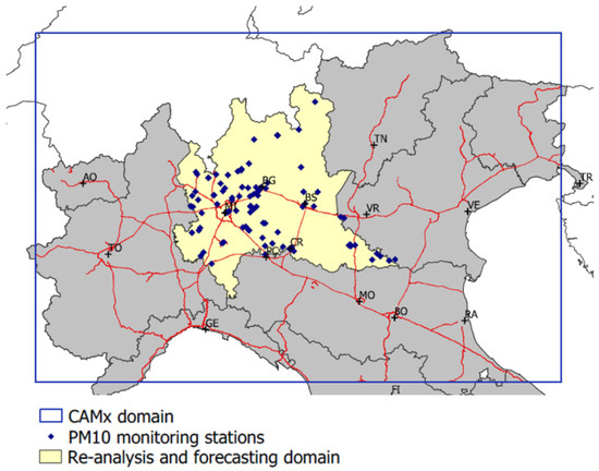 The methodology has been evaluated for the daily PM10 forecast on a Lombardy region (Northern Italy) domain (Figure 3), an area often characterized by high PM10 concentration levels leading to critical episodes (daily mean concentration higher than 50 g/m). In particular, the system has been run for the entire 2011 year and the forecast up to 3 days in advance has been computed. The selected domain covers a 540 × 360 km area with a 6 × 6 km spatial resolution. Emission input is provided by the INEMAR and EMEP [38] emission inventories. Table 1 presents total annual emission for each macro-sector for the year on the domain under study. The data include VOC, CO, NOx, NH3, SO2, PM10 and PM2.5 annual emissions for each cell of the domain. Monthly, daily and hourly pollutant specific temporal profiles are applied for different emission sources, seasons of the year and types of days (weekdays, days before holiday and holidays). Chemical characterization of VOC and physicochemical characterization of PM is performed using chemical and granulometric speciation profiles dependent on the emission activity. Meteorological input has been computed starting from the results of the WRF model. The 70 PM10 stations of the Lombardy region monitoring network were used for the integration of the CAMx results with the measurements. Fourteen tests have been performed grouped as: