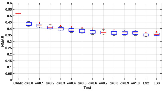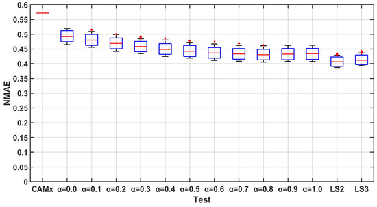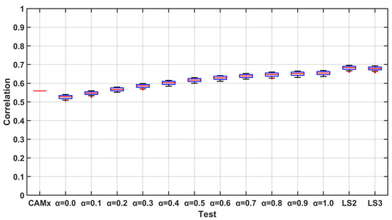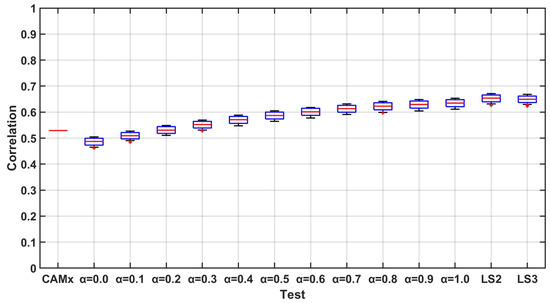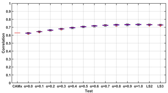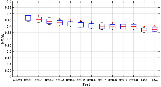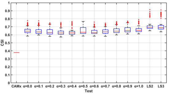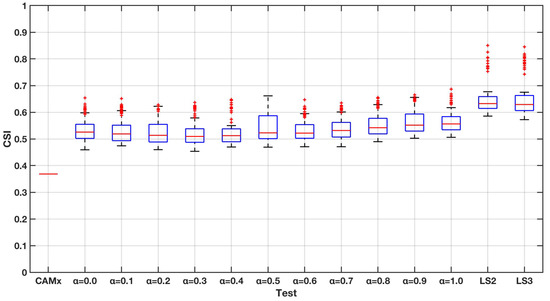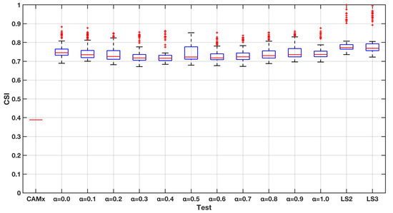 Following the idea presented in [36], in order to correctly evaluate the performance and uncertainty of the methodology, a Monte Carlo approach has been followed. In particular, 100 tests have been performed, randomly selecting 20% of the stations for the validation phase and using the remaining 80% for the optimal interpolation. The performances have been evaluated comparing the daily PM10 measured by the monitoring stations with the results of the system. The validation has been performed in two phases. In the first one, the forecasts have been evaluated using two different statistical indexes, namely the correlation coefficient and the normalized mean absolute error (NMAE). During the second phase, the capability of the model to correctly reproduce the critical events, expressed in terms of concentrations higher than the threshold, has been evaluated. Figure 4, Figure 5 and Figure 6 present the boxplot of correlation coefficient for the different performed tests. It can be easily seen that for the one-step-ahead forecast, the integration techniques ensures better results with respect to the “standard” case (). In general, the values of the coefficient is higher for the test, but the use of a memory did not grant an increase in performances. Moreover, the values of the index computed for the least square approach are comparable to those of the best weighted mean approach model, obtained for (persistent model). All the cases show a limited variability of the performances for the different tests, as highlighted by the boxes tops (1st and 3rd quartile) close to the median. Increasing the forecasting horizon to 2 and 3 steps causes a general worsening of the performances, in particular for lower value of . In fact for the worsening is so high that the case shows better or comparable performances. The least-square error approach shows lower sensitivity to the forecasting horizon, presenting a median that in these cases are consistently higher than the one of all the other tests (Figure 5 and Figure 6). The performances in terms of normalized mean absolute error (NMAE, Figure 7, Figure 8 and Figure 9) shows a bigger impact of the presented integration procedures. In this case, the value of the index computed for and tests is always better than that granted by even when the forecasting horizon increases. This can be explained by the fact that almost all the techniques are able to compensate for the underestimation of the PM10 concentrations typical of the models. The second part of the validation is more related to the objective of the forecasting system. It is a matter of fact that Local Authorities need a forecasting system able to reproduce the critical situation. For what concerns PM10, the critical situations are related to the exceedances of the concentration of 50 g/m as a daily mean. In order to evaluate the capability of the model to correctly reproduce these events, the Critical Success Index (CSI) also known as Threat Score has been computed for all the performed tests. The CSI can be computed starting from the contingecy table in Table 2 as: