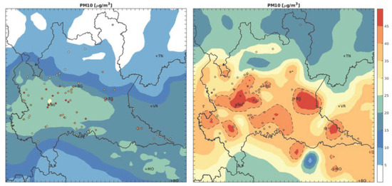 - Off-line re-analysis techniques, performing an ex-post integration of the measurements with the model results, once they are computed. Off-line techniques usually include statistical methodologies: optimal interpolation methods [23], kriging and cokriging techniques [24,25]. These techniques allow, for example, the computing of reanalyzed spatial concentration fields or, in the forecasting applications, the best known estimate of the initial condition for the next day/hour [26]. In [27] a bias correction technique is presented showing a good increase in the forecasting performances for PM, ozone and nitrogen oxides.