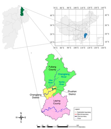 Jingdezhen is a typical small- and medium-sized city in China, with rapid social and economic development, and the population of Jingdezhen is almost 1.67 million. It is located in the northeast of Jiangxi province, and it belongs to the transition zone between the extension of Huangshan Mountain, Huaiyu Mountain, and Poyang Lake Plain (as shown in Figure 1). The city covers an area of 718.93 km2, between 116°57′ E and 117°42′ E and 28°44′ N and 29°56′ N latitude.