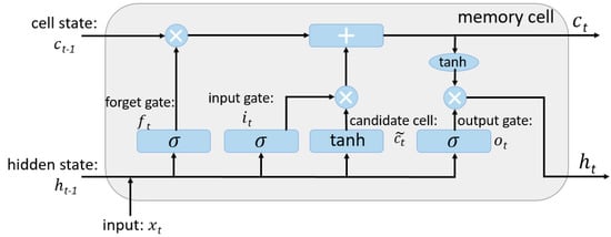 LSTM is a special kind of RNN, capable of learning long-term dependence. It was introduced by Hochreiter and Schmidhuber [], and was refined and popularized by many people in the following work. The difference between LSTM and RNN is that it adds a “processor”, which is called cell state, to the algorithm to judge whether the information is useful or not. In a cell, three gates are placed, called input gate, forget gate, and output gate, the architecture of the LSTM memory cell is shown in Figure 2.