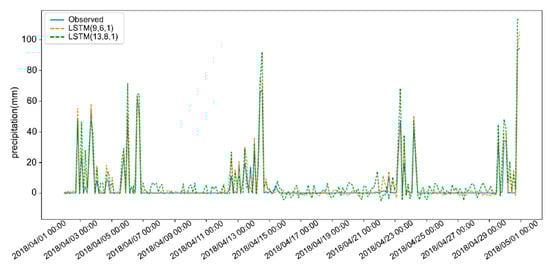 Figure 3 shows the precipitation prediction results for 3 h LSTM (9,6,1) and LSTM (13,8,1) in April 2018, which is the month with the largest precipitation in 2018. The predicted result LSTM (9,6,1) is better than LSTM (13,8,1). Therefore, after selecting meteorological variables by circular cross-correlation, the LSTM model with the selected nine input variables can perform better.