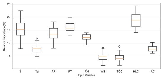 The relative contribution of input variables to the output value was quantified using the modified Garson’s weight method. Figure 4 shows the relative importance of the nine variables obtained from Garson’s connection weights method in the form of a box plot. According to the different random initial weights, great changes in the importance values will be observed. Results show that in the LSTM (9,6,1) model, HLC shows the strongest relationship with predicted precipitation and its contribution of median value is 18.24%. TCC shows the weakest relationships; the contribution of the median value is less than 5%. There are several abnormal values, but the proportion is very low, so they are ignored. The top five important predictors are HLC, PT, T, AP, and RH.