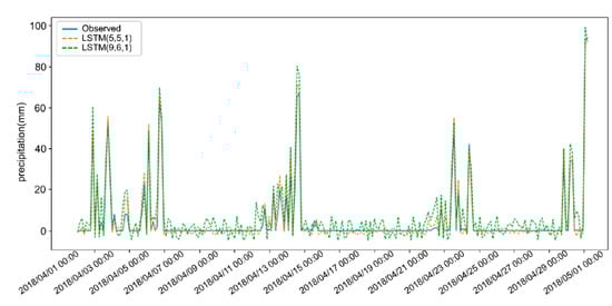 The precipitation prediction results by LSTM (5,5,1) and LSTM (9,6,1) for 3 h in April, 2018 are shown in Figure 5. The predicted result LSTM (5,5,1) is evidently better than LSTM (9,6,1). Therefore, after further refining meteorological variables by the relative importance of input variables, the LSTM model can perform better.