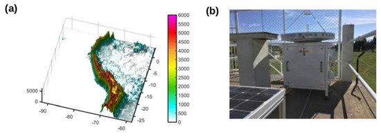 The Global Precipitation Measurements (GPM) satellite consists of a dual-frequency radar (Ku and Ka band) to improve the rainfall estimation from space. For example, in a recent study, Kumar and Silva [39,40] reported the vertical profile of rain and DSD parameters over South Asia and South America. However, due to the strong ground reflection, they were not able to measure the rainfall intensity near the surface (<1 km, e.g., the lowest range of the altitude). A heavy rain attenuation in the satellite-based radar is an important issue. Past studies considered the uniform regions below the ML and used No adjustment technique [2] to get the correct information of the rain rate profiles. However, the further investigations are required through the GPM satellite, especially over the remote areas. The instantaneous ground rain rate is very important for flood warnings and other warning systems and a close examination using the ground-based observations near the ground and near the ML will improve the understanding of the rain rate near surface. In 2015, the Instituto Geofísico del Perú (IGP) installed a vertically pointed profile rain radar (VPRR, Figure 1b) namely MIRA35c at Huancayo (HYO, 12°S, 75.3°W) to investigate the rainfall characteristics in the mountain valley especially in Mantaro Basin. Various moisture and directional fluxes play a vital role in the precipitation distribution over the tropical Andes [17,18,19,20,21,22,23,24,25,26,27,28]. For example, the rainfall over the tropical Andes is affected by the low-level jet (LLJ) and surface flow (Figure 1a) at eastern and western flank of Andes [10,34,41]. The counterclockwise upper-level Bolivian high (BH) and mountain-valley circulations affect the rainfall over the tropical Andes [42,43,44]. Orographic features also modulate the wind patterns at different pressure levels, microphysical processes, and DSD parameters and affect the surface rainfall [10,19,40,41,45,46,47].