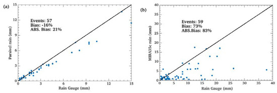 Comparison of the accumulated rainfall between (a) disdrometer and rain gauge and (b) rain gauge and MIRA35c.