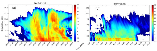 Figure 3 shows an example of the vertical profile of Ze measured through VPRR. In the first case (Figure 3a) the Ze pattern shows the highest Ze values near the surface between 23 UTC (18 LT) to 02 UTC (21 LT). The Ze values are more than up to 40 dBZ in the first few kilometers above the surface, but Ze value decreases drastically (−15 dBZ) at a higher altitude. It indicates the larger number of hydrometeors (rain and hail). In the second case (13 December 2017) the VPRR captured the stratiform regimes of the cloud systems with the well defined bright band (~4.7 km altitude). Above 5 km the Ze values are less than 15 dBZ and indicate the light rain and drizzle. An anvil structure is also observed, where a lower Ze is observed at >6 km, with no significant Ze values at the lower altitude and indicates the anvil precipitation structure [57].
