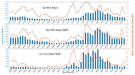 Figure 4 shows the diurnal variation in the surface rainfall during the study periods. The mean and maximum of rain rate follow the diurnal patterns, and, consistent with the past study over the other locations over the tropical Andean [10,18,27]. The mean rain rate consists of the two maxima namely afternoon (17:00 to 19:00 LST) and midnight hour (1:00 to 3:00 LST). However, the mean of maximum rain rate has several maxima during the study periods. DJFM and SON have similar trends, however, the mean rain rate is higher during SON (~0.4 mm/h) months compared to DJFM months (~0.35 mm/h). The difference between afternoon and mid-night maxima is higher during SON compared to DJFM and indicates that most of the rainfall maxima occur during the afternoon, and could be related to topographical condition and diurnal variation of the surface temperature rather than the seasonal variation [19,20]. For example, the mean rain rate peaks (has higher rain rate values) at ~0.35 mm/h and 0.18 mm/h in the afternoon and early morning during DJFM months respectively, whereas corresponding values are ~0.4 mm/h and ~0.05 for SON months in afternoon and early morning, respectively. Second, the DJFM months have a clear maxima at 18:00 LST, and, then decreases around 18:00 LST, whereas maxima in mean rain rate spread for the time between 15:00 to 18:00 LST during SON months.