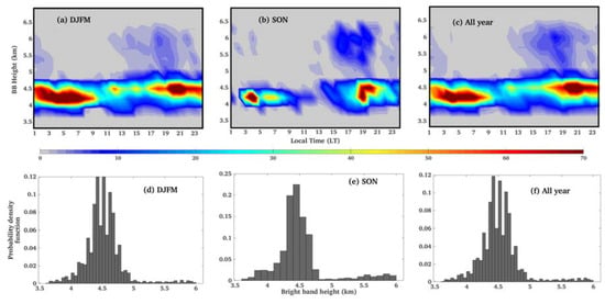 Figure 5 shows the diurnal variation (a–c) and probability density distribution (d–f) for bright band height. It is observed that bright band height is higher during the summer monsoon season compared to pre-monsoon seasons. The bright band height mostly lies between 4 to 5 km altitude. This is somewhat consistent with the past studies and observed bright band height for the other stations over the Andes mountain [17,18,37]. The probability of bright band height decreases sharply after 5.0 and 4.7 km during DJFM and SON seasons respectively. However, irrespective of the diurnal cycle more than 70% of bright band lies less than the 5 km altitude, and only less than 20% bright band height is smaller than 5 km altitude. The probability density distribution of bright band shows the seasonal variation. For example, DJFM months have the two peaks (~4.4 and ~4.6 km), whereas SON has a single peak near 4.5 km altitude, and, the maximum height of bright band lies between 4.2 to 4.6 km altitude. The bright band height shows the role of solar heating at the higher topographic areas [17,18,37]. For example, first, the higher density of bright band with higher altitude found either afternoon or evening. Although, there is a possibility that bright band could rise more than 5 km, mostly in the afternoon and late-night (13:00 LST to 23:00 LST), and follow a heating pattern over the tropical Andes [17,18,37].