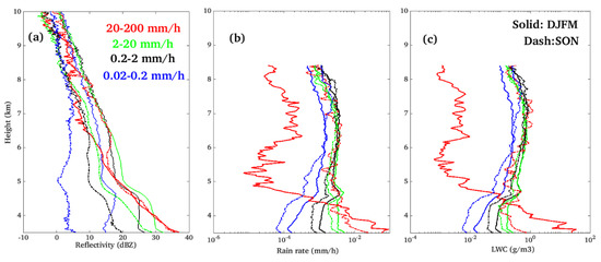 Figure 6 shows the vertical variation of Ze, rain rate and LWC (gm−3) during DJFM and SON months for different rain rate classes. It is observed that monsoon months consist of an intense Ze vertical profile compared to pre-monsoon seasons, whereas in the mixed-phase altitude (6–9 km) the average Ze is higher during SON seasons except for rain rate ≥20 mm/h. The maximum differences in average Ze profiles occur between the mixed-phase regimes, whereas above the 9 km altitude, the average Ze profiles merge and consistent with the longterm TRMM and GPM observations [40,66,67,68,69,70,71]. For the near-surface rain rate <0.2 mm/h, the average Ze profiles have a negative slope and Ze decreases with the height through all the vertical column [40,72]. However, in general, the average Ze profiles can be divided into two regions, e.g., below and above the 5.0 km altitude (very near to 0 °C; Figure 6a). Below the 5 km altitude, the average Ze either increases, decreases or remain constant with the altitude, and depend on the different class of RR. However, above 5 km, the average Ze decreases as the altitude decreases for all classes of RR. Within the lowest, ~1 km altitude near the surface, the average Ze is highest for rain rate ≥20 to 200 mm/h and least for rain rate ≤0.02–0.2 mm/h. Above the 5 km altitude, average Ze shows the different characteristics, and least for the near-surface rain rate ≥20 mm/h during DJFM months, which is related to the attenuation issue discussed earlier [1,38]. The opposite slope of Ze below and above the 5 km altitude, are related to the growth and decay of the hydrometers in cloud systems and depends on the cloud microphysical processes [67,68,69,70,71,72].