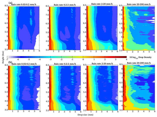 For rain rate ≥20–200 mm/h, a higher concentration of droplets with Dm < 2 mm are observed above the ML compared to other classes of rain rate. The role of orographic upward-wind is evident, and most of the small-sized of raindrops are removed due to strong wind and also consistent with the other tropical locations [31,56]. At the same time, a higher concentration of bigger raindrops (Dm ≥ 4 mm) is observed in the lowest regimes of the altitude compared to other class of near-surface rain rate. Since the rain rate ≥20 mm/h mostly corresponds to convective rainfall and consists of the evolution of bigger raindrops near the surface. These observations indicate that there is a much higher possibility of collision-coalescence processes at the lower height range, whereas the ice microphysics are responsible for bigger raindrops within the mixed-phase regimes [12,14,17]. HYO is located at ~3.2 km above the mean sea level and very near to the bright band height, and, once the snow or ice crosses the 0 °C height, they melt and create the bigger raindrops, which falls quickly to contribute to higher near-surface rain rate. Gatlin et al. [74] used ground-based radar data and explained that a thick bright band height, causes an enhancement in raindrop size below the bright band and also extends up to the surface. Several studies also revealed that larger raindrops were observed at the ground because of intense Ze values in the bright band. The constant cloud base layer within the boundary layer affects the DSD variations [76] whereas internal dynamics (shallow layer with the upper layers) at the tops of the hills contribute to the number-controlled processes (e.g., collision-coalescence and breakup). In dynamic equilibrium, these processes produce the smaller raindrops and show a uniform vertical profile at high-altitude regions [38,75].