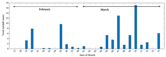 Figure 8 shows the daily accumulated rainfall during campaign periods (e.g., 18 February to 14 March 2019). The rainfall can be divided into dry and wet spells (4 March to 10 March 2019). 16.3 mm rainfall was recorded within the 24 h on 10 March, followed by 7 March and 25 February 2019, with 12.2 and 10 mm of accumulated rainfall respectively. In the next section, we will use the in situ observations and reanalysis data to investigate the atmospheric variability to produce the rainfall events.
