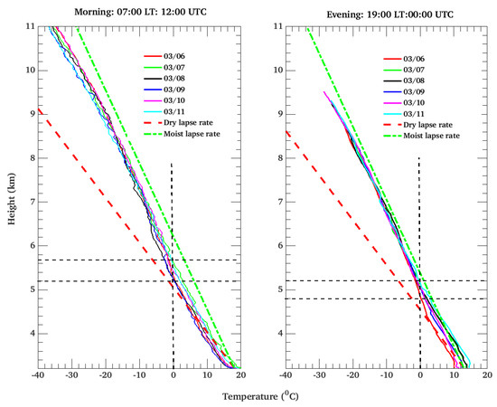 Vertical temperature profiles during rainy periods recorded by radiosonde launches in 6 March to 11 March at the site of the Huancayo. Representative moist and dry adiabatic lapse rates are indicated by the long and short-dashed lines, respectively.