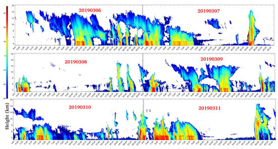 Figure 9 shows the vertical profile of air temperature collected between the 3rd to 11th March in the early morning (07 LST) and afternoon (19 LST) along with a dry and moist lapse rate. The observed temperature profiles are nearer to the moist lapse rate during the nighttime. There is no significant inversion mechanism is observed during the wet spells, and, all the temperature profiles cross the 0 °C only once. The 0 °C lies between 5250 and 5550-m which is nearly 150–200 m higher than the observed climatological bright band (Figure 5). These results are consistent with the past finding [59], where bright band existed 253 m below the 0 °C level because of the time taken by the frozen hydrometeors to melt with respect to ambient temperature. Figure 10 shows the vertical profile of Ze collected during wet spells. It is observed that most of the rainy days consist of the cloud systems with a well defined bright band [18] in stratiform precipitation. Although few convective events are also observed and tabulated in Table 4 [21]. For example, 10 March has the highest accumulated rainfall (16.8 mm) and consists of a clear bright band structure between 4:00 to 6:30 UTC, whereas, intense convection is observed at 23:40 UTC and lost for nearly 3 h.
