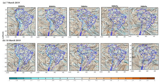 Figure 11 shows the wind-stream lines at 18:00 UTC for at lower (950, 850 hPa), mid (700, 500 hPa) and upper-pressure levels (200 hPa) for 7th and 10th March. The wind circulations show different characteristics during two CPEs and SPEs. For example, a well-defined north-easterly circulation was observed along the east side of the Andes that follows the SALLJ at 850 and 950 hPa on 7th March 2019 (Figure 11a). These north-easterly circulations favor the intrusion of moisture from the Amazon basin to the central Andes. In contrast, on the 10th March (Figure 11b) the easterly circulations are restricted at low latitude (around 15° S), probably due to the disturbance produced by two anticyclonic circulations centered at (20° S, 50° W) and (40° S, 58° W). The last anticyclonic was also observed at 850 and 950 hPa and is probably associated with the south-west displacement of the South-Atlantic high-pressure system (Figure 11b), which favors the south-easterly circulations along the east side of the Andes that could disfavor the intrusion of moisture from the Amazon basin to the central Andes.