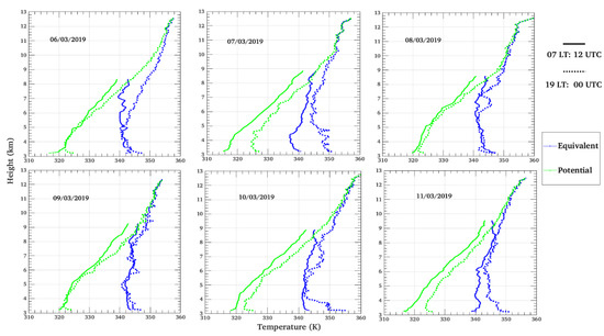 The characteristics of the CPEs depend on the static stability of the environment, wind speed and wind shear [77]. Sounding results between 06–11 March at 07 and 19 LST are shown in Figure 12, whereas sounding results at 13 LST are shown in Figure 13. For all the rainy days, a stable atmosphere is observed at 07 LST that creates an air potential temperature gradient (θ) directed towards the surface with values between 315 K and 320 K near the surface. On 7, 8 and 10th March, a negative gradient in the equivalent potential temperature (θe) was observed at 07 LST, which indicates a slightly conditionally unstable layer in the first 4 km, and probably caused by a presence of high moisture content in these days with surface value of θe near to 340 K. In contrast, at 13 LST a highly unstable condition was observed, with higher negative gradients in θe on 07, 10 and 11 March. However, the release of conditional instability occurs only when θe is almost equal to θe* (saturation equivalent potential temperature) near the surface. This situation was observed on 07 March at 1500 m, on 08 March at 3000 m and on 09 March at 2500 m.